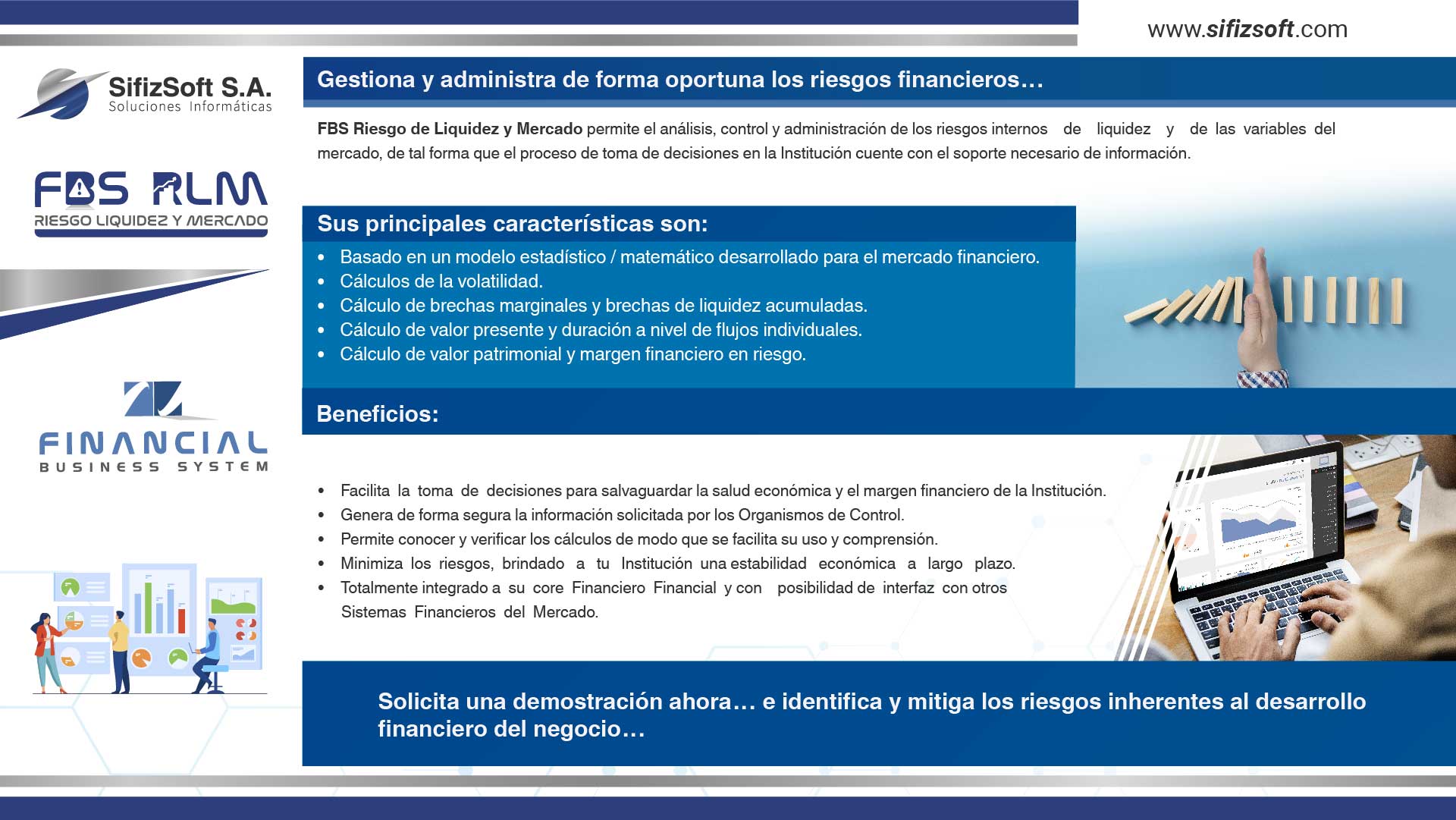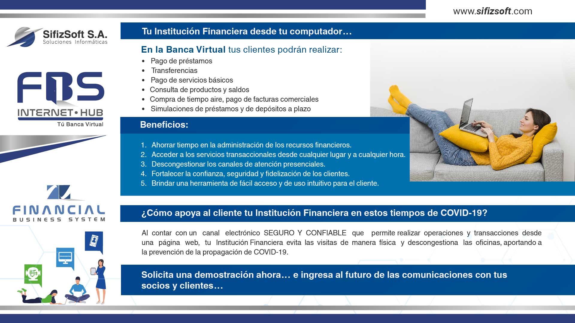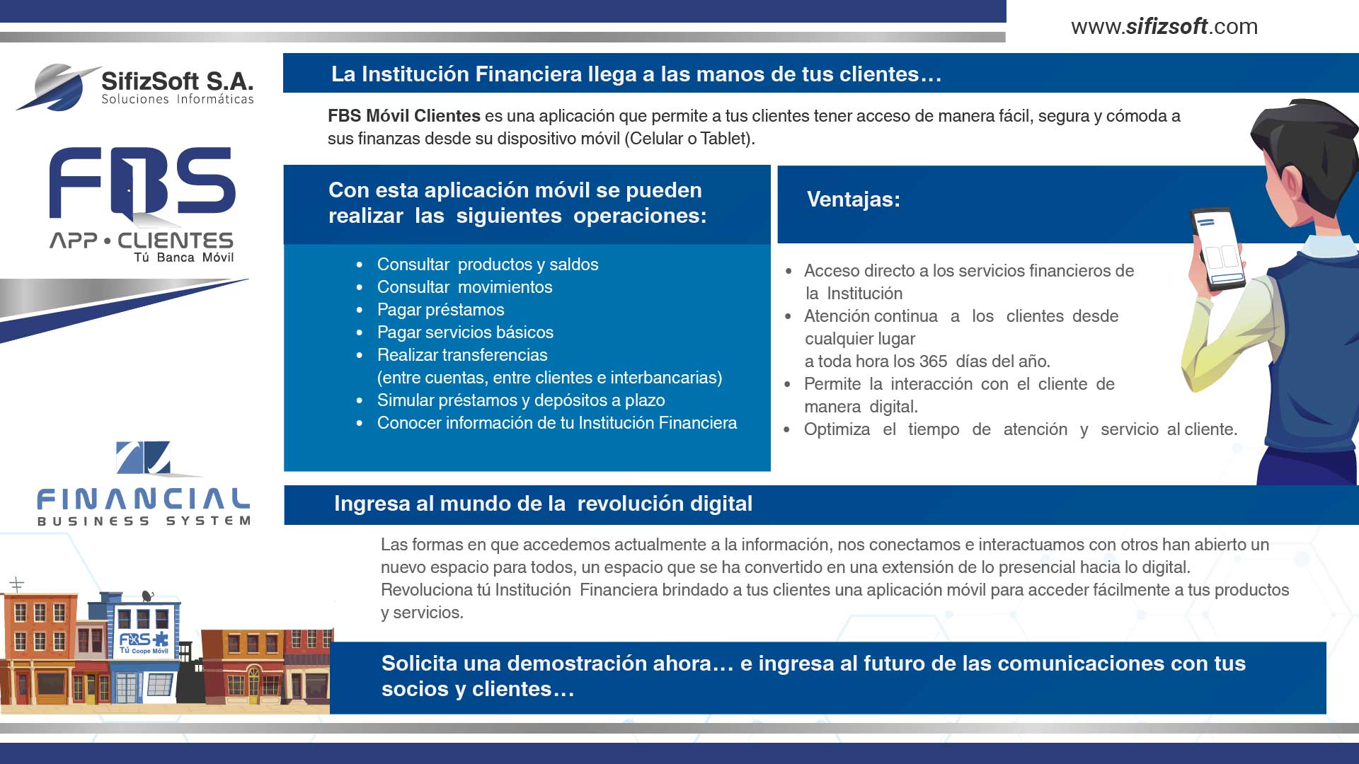 SifizSoft S.A. es su socio estratégico encargado de proveer el recurso humano, tecnológico y metodológico completamente experimentado, que le permitirá a su Institución Financiera cumplir sus objetivos de una manera organizada, sostenible y vanguardista. El uso de las mejores herramientas de tecnología de información agrega valor a las operaciones del negocio financiero obteniendo como resultado el crecimiento de nuestros clientes.